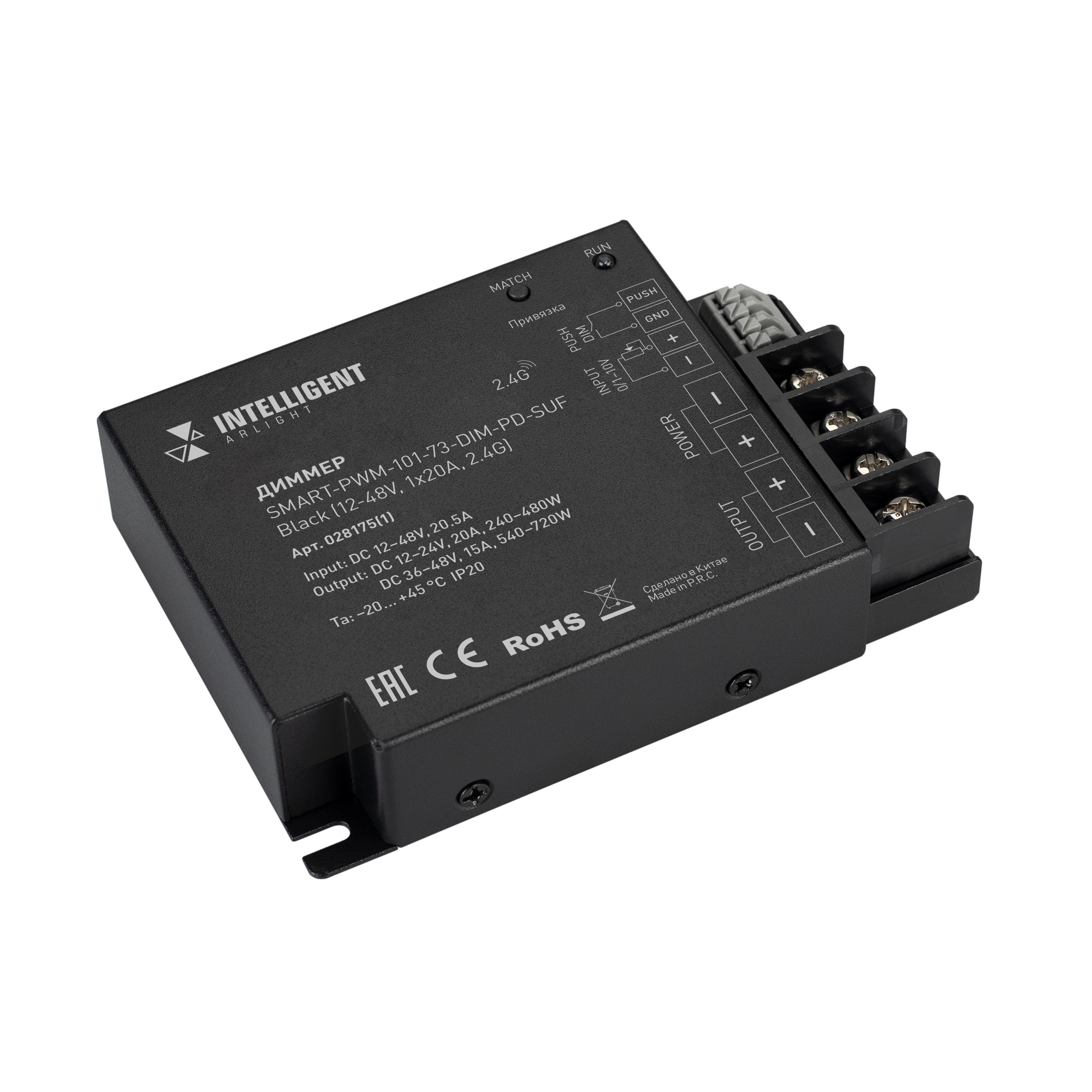 INTELLIGENT ARLIGHT Диммер SMART-PWM-101-73-DIM-PD-SUF Black (12-48V, 1x20A, 2.4G) (IARL, IP20 Металл, 5 лет) 028175(1) в Тюмени
