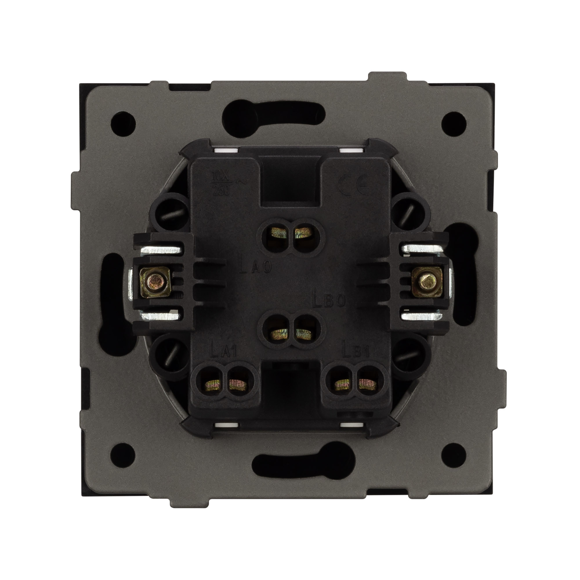 Механизм выключателя света на 1 пост 2 клавиши (непроходной). Цвет - черный. Без фронтальной рамки. Уровень пылевлагозащиты IP20. Выключатель устанавливается в стандартный круглый подрозетник круглого сечения диаметром 60мм.