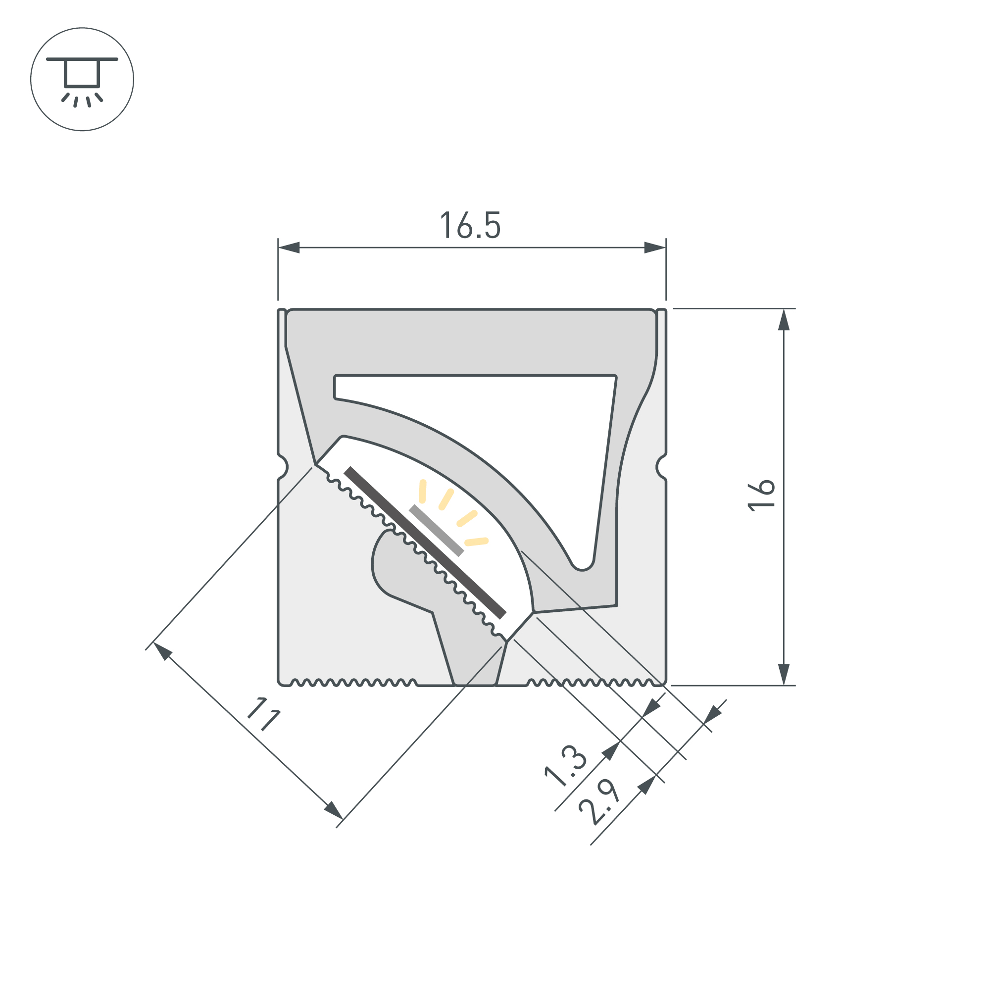Цельнолитой силиконовый гибкий профиль, белый матовый. Габаритные размеры 10000×16×16 мм. Вертикальный изгиб TOP, минимальный радиус изгиба 50 мм. Горизонтальный изгиб SIDE, минимальный радиус изгиба 200 мм. Для установки во влажных помещениях необходима герметизация при помощи двухкомпонентного эпоксидного герметика. Класс пылевлагозащиты – IP65 (при соблюдении технологии герметизации). Для лент шириной 10 мм, высотой до 2,8 мм и мощностью до 10 Вт/м. Угол излучения 115°. Поставляется в катушках по 5 м. Цена за 1 м.